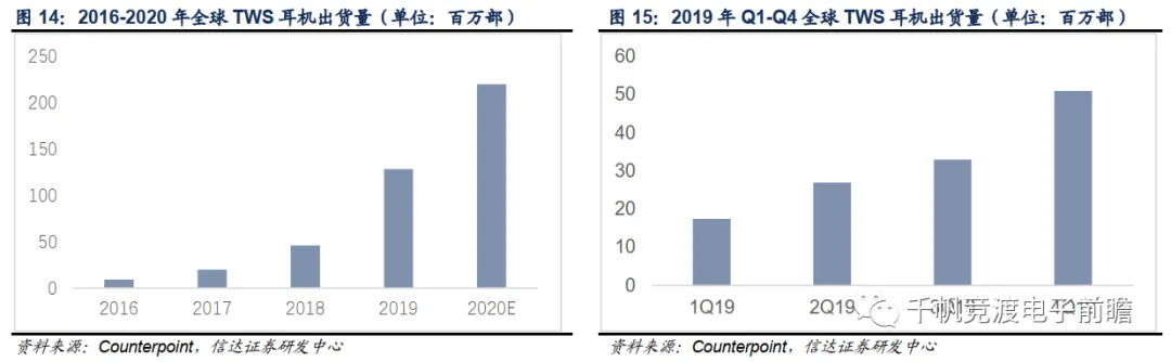 随着性能的改善,用户体验的提升,TWS耳机越来越多的为用户所认可,出货量不断加速,呈现爆发式增长。据Counterpoint统计,2016年全球TWS耳机出货量为918万部,主要由初代AirPods贡献;后续伴随着AirPods新品迭代及非A公司切入市场,TWS耳机的出货量增幅不断扩大,2017-2019年出货量分别为2000万、4600万、1.29亿部,对应YOY分别为118%,130%和179%。连续三年实现一倍以上的强劲增长。就季度数据来看,2019年Q1-Q4 TWS耳机出货量分别为1750万、2700万、3300万和5100万部,呈逐季加速态势。