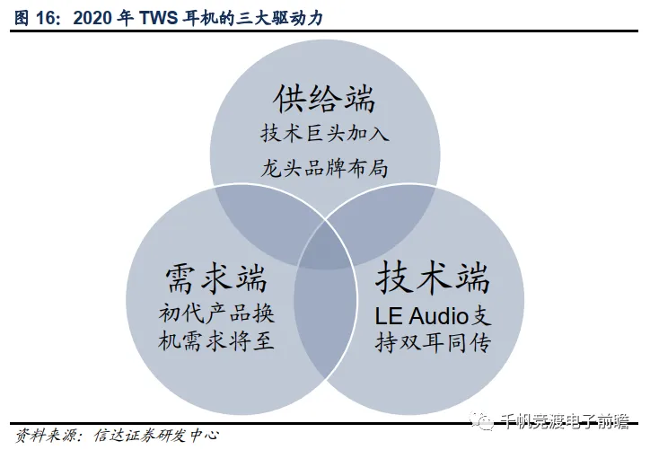 (1)供给端:亚马逊,谷歌和微软等技术巨头有望进入真无线可听设备行业,通过平台化战略推动行业标准化;而三星,小米和华为等现有的智能手机巨头也将继续拓展业务,开发TWS耳机新品。