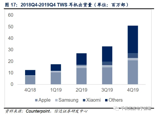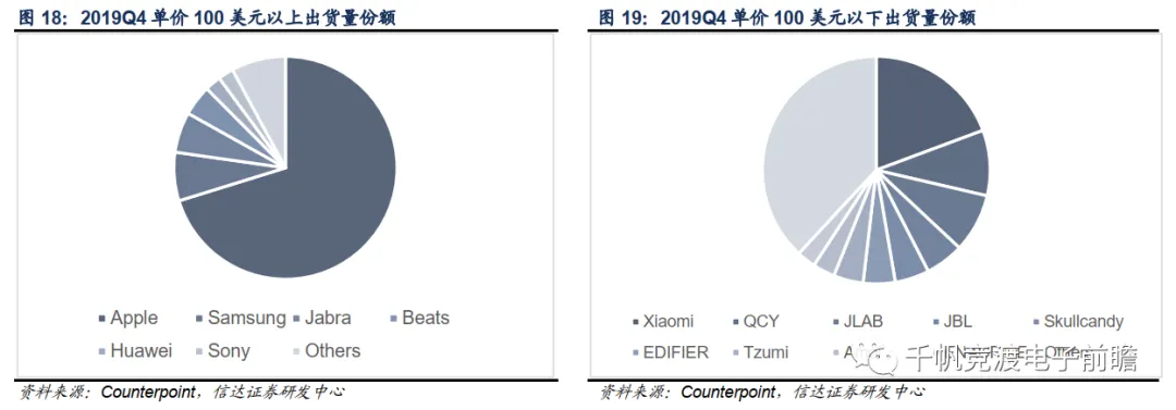 就品牌竞争格局来看,苹果树立了TWS耳机价位段及性能的标杆,安卓系品牌也在快速扩张中。据Counterpoint统计,2019年全年TWS耳机出货量前三名分别是苹果,小米和三星,占比分别为47.1%,6.1%和5.8%。
