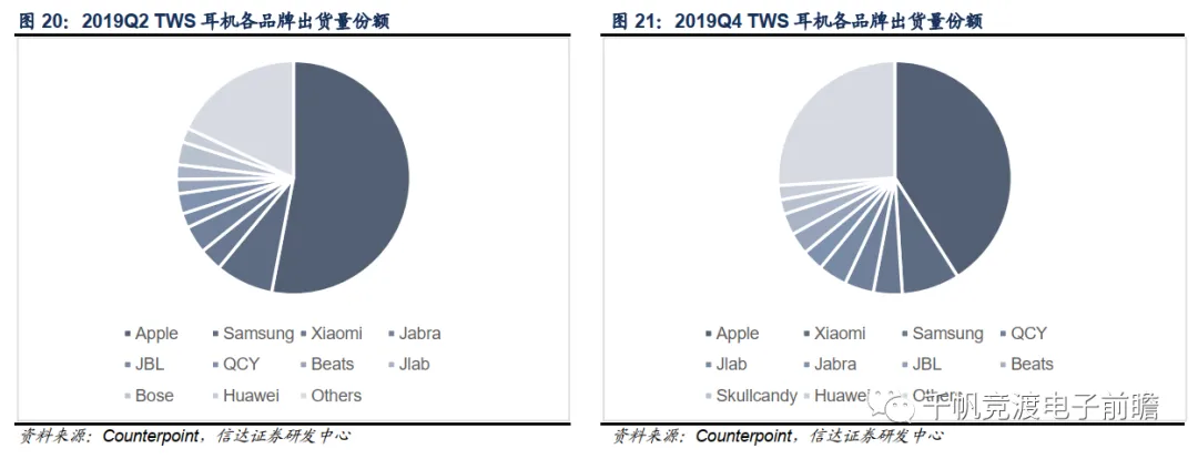 我们在下文中列出了2019年Q2和Q4的品牌市占率,二者对比可见,不少品牌的市场占有率有所下降,表明越来越多的厂商加入了TWS耳机市场的角逐。与苹果拥有完整封闭的生态不同,安卓手机用户的TWS耳机选择众多,除主流手机品牌外,还有众多南方小厂入局,各厂家展开激烈竞争,大量竞品涌现。