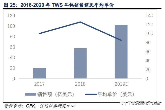产品均价方面,据GFK统计,2017-2019年全球TWS耳机市场规模分别为20亿,57.76亿和102.09亿美元,ASP分别为100美元,126美元和85.08美元。可见TWS耳机的单价在2019年有较为明显的降幅,这恰与前文中描述的,白牌TWS耳机在2019年快速放量,带动了整个耳机市场均价下行的情况相吻合。