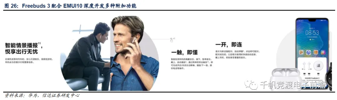 以华为为例,其Freebuds 3在连接华为手机后可以自动弹窗、可以从手机反向无线充电、无需额外app即可在系统里设置降噪模式、可智能检测佩戴状态控制播放和暂停、可以智能情景播报自动提示出行信息,这些都是与华为手机搭载的EMUI10操作系统配合深度开发实现的功能,需要手机SoC与耳机主控芯片的配合,这亦是非手机厂商产品无法实现的。