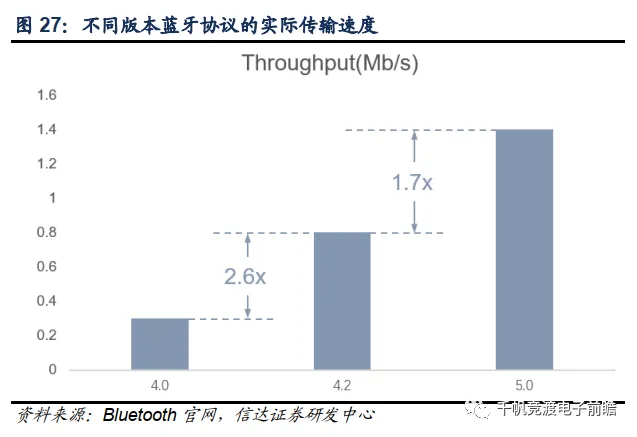 (1)更高带宽:相比于此前的蓝牙4.2,蓝牙5.0的带宽从1Mbps提高到了2Mbps,实际传输速度为蓝牙4.2的1.7倍,这大大缩短了耳机与手机终端间和主副耳机间同步的响应速度,使得TWS耳机的延迟问题得到较好的解决。