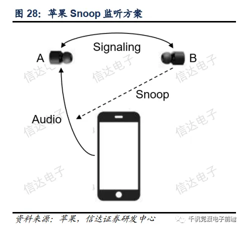 监听(Snoop)方案主要由苹果采用,公司自AirPods一代开始就采用了自研的监听方案,A耳机与手机终端连接后将密钥发给B耳机,B耳机通过密钥监听手机音频信号。而AB两耳机中都有具有完整功能的主控芯片,因此都可以作为主耳机工作,在单耳使用时主从耳机也能实现无缝切换。
