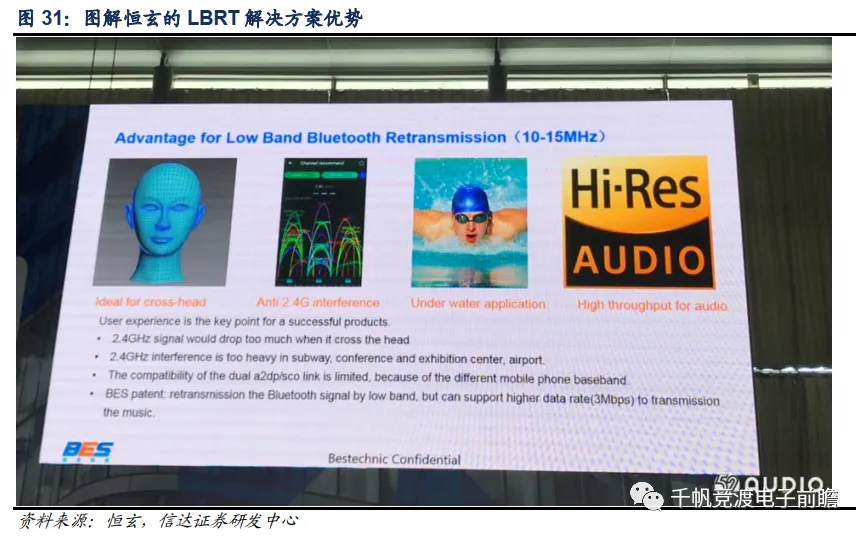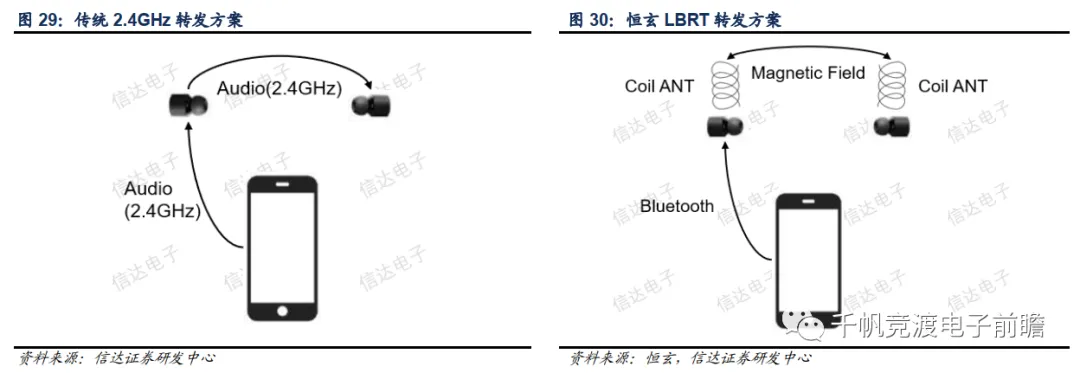 为了解决传统转发模式的延迟问题,国内TWS耳机芯片龙头厂商恒玄于2018年推出了低频转发技术(Low Band Retransmission,简称LBRT)的BES2300系列芯片,手机将一个双声道的2.4GHz蓝牙音频信号发送给主耳机,主耳机则通过磁感应线圈向副耳机发送一个低频磁感应转发信号。传统的转发模式延迟高,穿透力差,而恒玄主打的低频磁感应信号穿透性好,响应快,不易受到其他2.4GHz信号干扰,因此延迟较低,能避免音质损耗。恒玄的LBRT转发方案可大幅降低功耗,并且可以外接各种传感器和存储器,不过需要在耳机中加入低频天线。