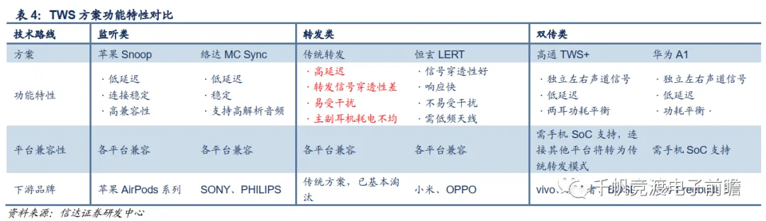 我们在此将上述三大类方案的优缺点做横向对比分析。可见除传统转发外,目前市面上的主流芯片方案均已解决了连接延迟,稳定性的问题。但兼容性方面,主流的双传方案如高通TWS、华为A1需配合对应的手机SOC使用。