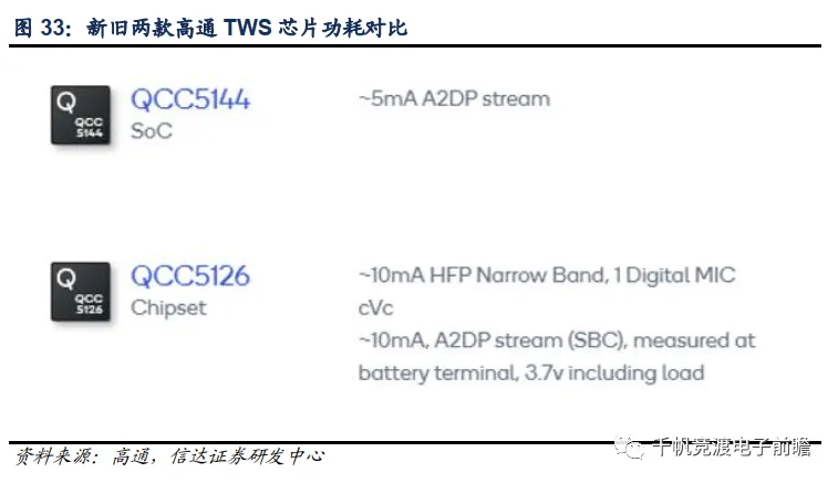 除连接性外,功耗也是TWS耳机芯片的重要参数,功耗降低会提高续航表现,提升用户体验;此外芯片单价的下降也会助力渗透加速。