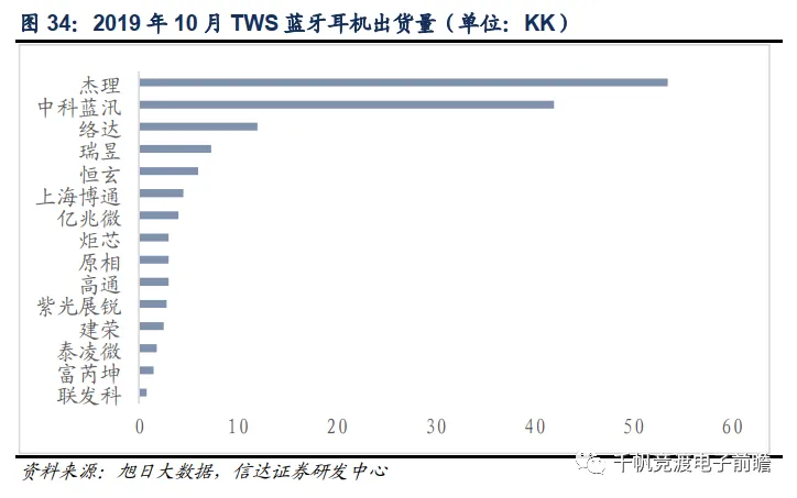 其他中小品牌也有众多的芯片供应商选择。大陆有珠海杰理、中科蓝讯,台湾也有瑞昱和原相,他们的TWS蓝牙芯片较为低价,上述芯片厂商共同支撑起了2019年TWS耳机市场的迅速增长。