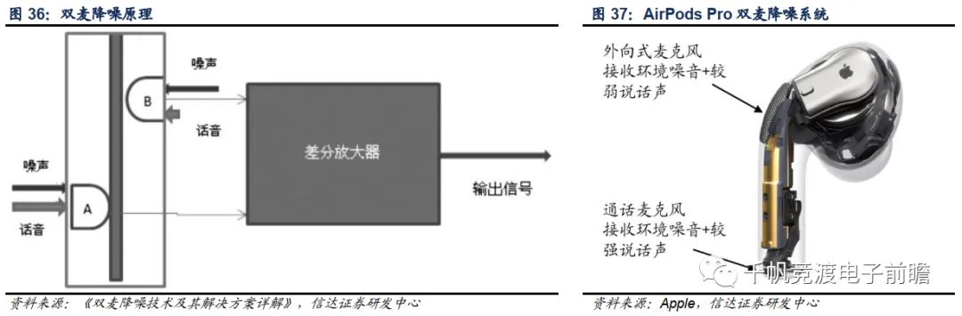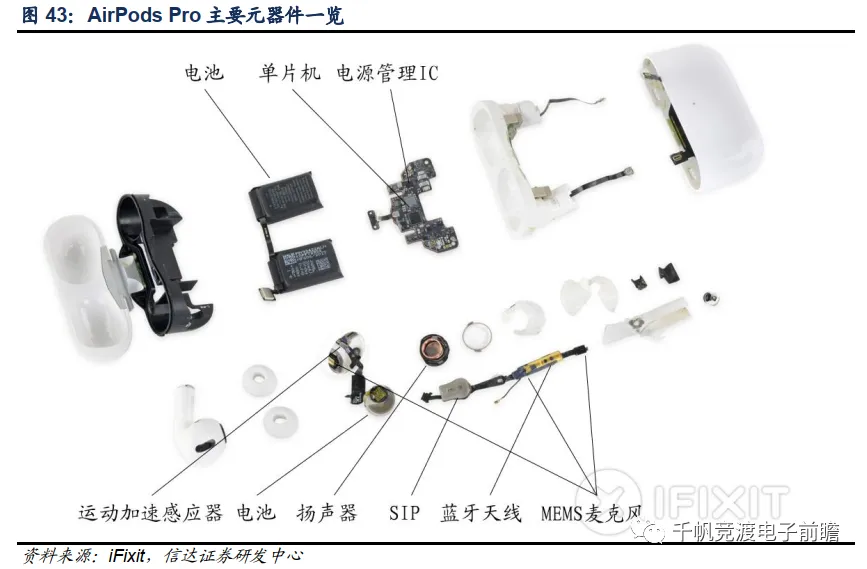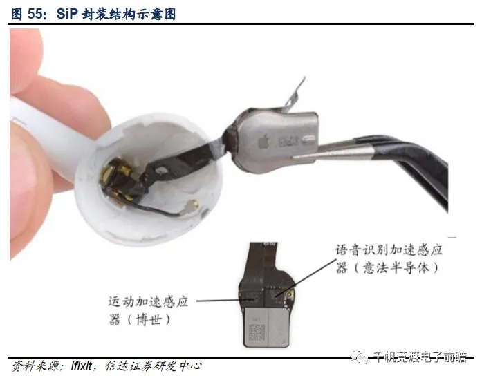 除上述供应链环节之外,苹果的Airpods Pro还创新性地导入了SiP封装方案,在同一个封装件中集成了用于实现上行通话降噪的语音识别加速感应器、用于检测佩戴状态的运动加速感应器等等诸多器件。内部空间的节省使得AirPods Pro得以加入了更多的MEMS麦克风、主动降噪芯片等,实现了更多增值功能。