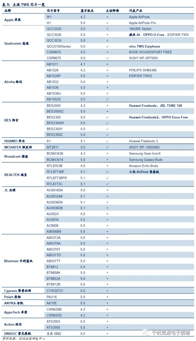 我们整理了目前主流的TWS耳机厂商芯片方案,可以看出目前主流的音频方案几乎都支持了蓝牙5.0标准,更有部分产品已经开始支持最新蓝牙5.1标准。