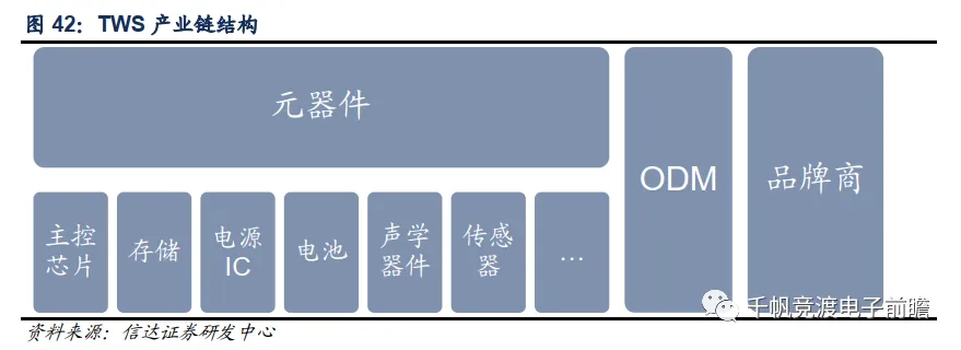 TWS耳机产业链主要有元器件、ODM、品牌商三大部分,具体到元器件,细分下来有主控芯片、存储器、电源管理IC、电池、声学器件、传感器等。我们认为在TWS耳机快速增长的当下,除了主控的蓝牙芯片外,其他各个环节亦值得关注。