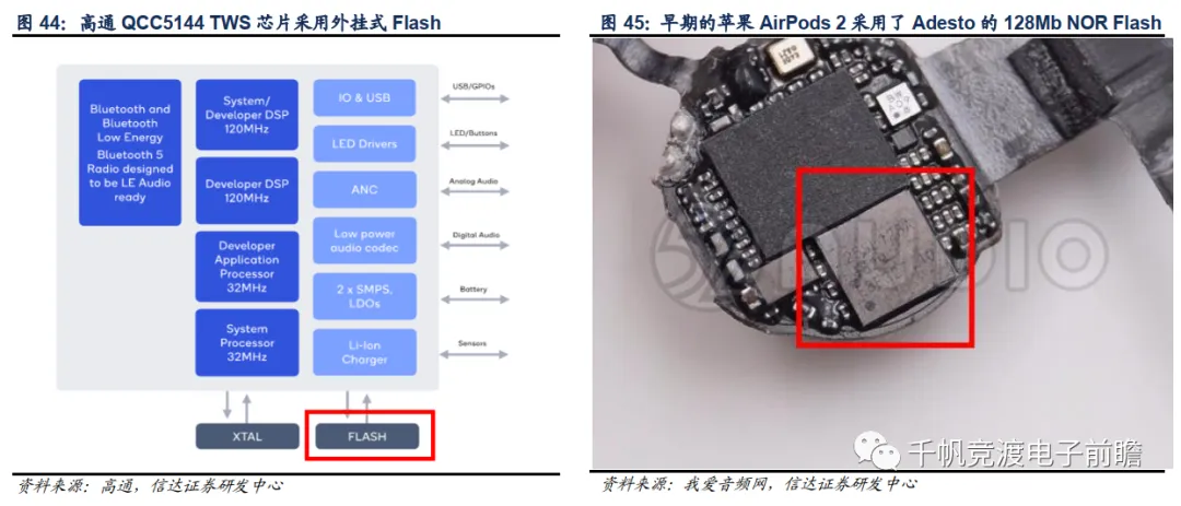 目前,TWS耳机的NOR Flash存储容量最高支持128Mb,以苹果AirPods 2为例,早期产品搭载了两颗美国Adesto生产,型号为25SL 128A的128Mb NOR Flash。而伴随着国内芯片厂商的崛起,兆易创新在2019年成功取代了海外竞争对手,成为苹果AirPods 2及AirPods Pro的NOR Flash一供,并占据了绝大部分份额。