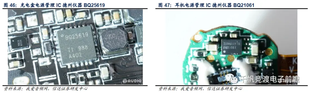 续航及充电表现对于TWS耳机的使用体验至关重要,电源管理IC在这其中就扮演了关键作用。TWS耳机和充电盒都需要电源管理IC,以OPPO Enco Free为例,下图展示了其充电盒电源管理IC(TI BQ25619)和耳机电源管理IC(TI BQ21061)。充电盒里面电源管理IC既要负责降压输入为充电盒内部电池充电,还需要负责充升压输出为耳机充电。此外还肩负安全防护、电量显示、低功耗待机,部分产品还要支持无线充电功能。耳机电源管理IC则需要快速准确地为小型电池充电,更重要的是为系统提供稳定电压来实现最佳的系统运行。