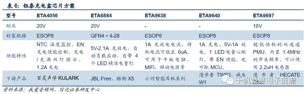 电源管理IC:TWS耳机作为一款便携电子产品,电源管理芯片在向高集成度、小体积发展,2019年钰泰半导体提出了应用于充电盒的Power SOC设计,以取代传统的MCU加分离式电源控制芯片组合的方案。目前已有漫步者、JBL等品牌大量采用。而其他国内厂商,如矽力杰、英集芯、思远等诸多厂商也开始跟进。