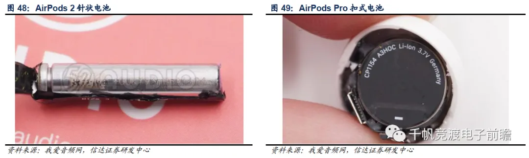 TWS耳机电池主要有针状电池和扣式电池两类。针状电池是一种早期的方案,以AirPods系列为例,AirPods 2采用了LG生产的针状电池,容量为25mAh,可提供5小时续航。而AirPods Pro由于加入了主动降噪等新增功能,提高了功耗,需要更大的电池容量。