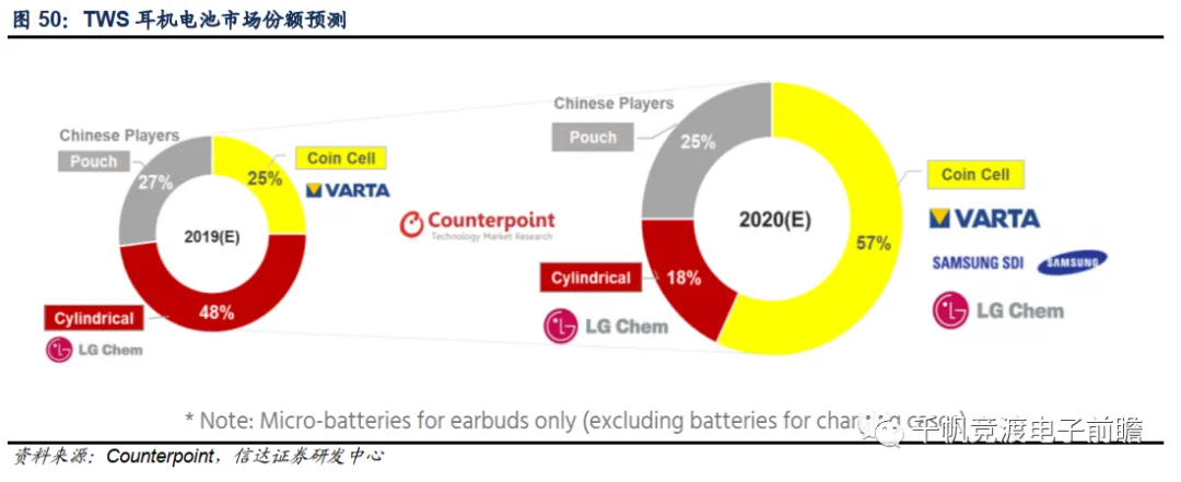 由于2019年TWS耳机销量的迅猛增长,也带来了电池需求的暴涨。Counterpoint预计,2020年微型电池市场将实现90%的增长。2019年扣式电池占市场份额的百分之25%,2020年这一份额将上升至57%,而针状电池市场份额将从48%下降到18%。用于低端设备的袋装聚合物电池将继续保持四分之一左右的市场份额。