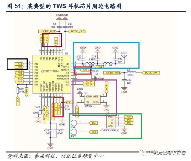 下图展示了一种典型的TWS耳机蓝牙芯片周边电路图,紫色框图部分即为晶体电路,采用了一颗32MHz晶振产生基频供芯片主频和射频电路使用(蓝色框图为射频电路)。