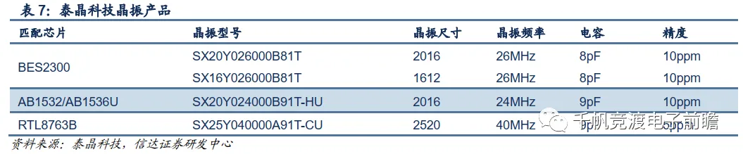 考虑到TWS耳机对小尺寸晶振的需求,目前能批量出货符合TWS耳机标准的1612/2016晶振的供应商不多。以大陆晶振领域龙头泰晶科技为例,公司在恒玄BES2300平台有26MHz 2016和26MHz 1612两种产品进入认证,此外还有24MHz 2016和40MHz 2520产品匹配台湾络达AB1532/AB1536U和台湾瑞昱RTL8763B芯片。