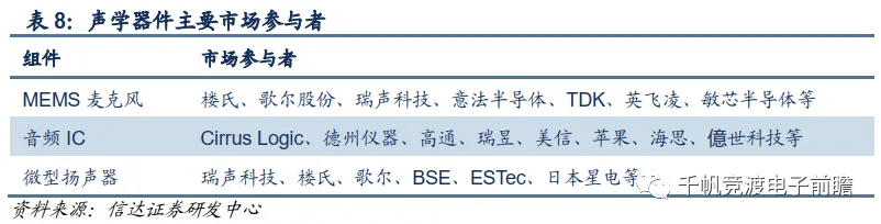 声学:TWS耳机的声学系统分为三部分:MEMS麦克风、音频IC、微型扬声器。(1)MEMS麦克风市场的主要参与者有国内的歌尔股份、瑞声科技,和美国的楼氏等。(2)音频IC即音频编解码芯片,主要有Cirrus Logic、TI、ADI、高通等。(3)微型扬声器方面,以歌尔股份和瑞声科技两大电声巨头为代表。