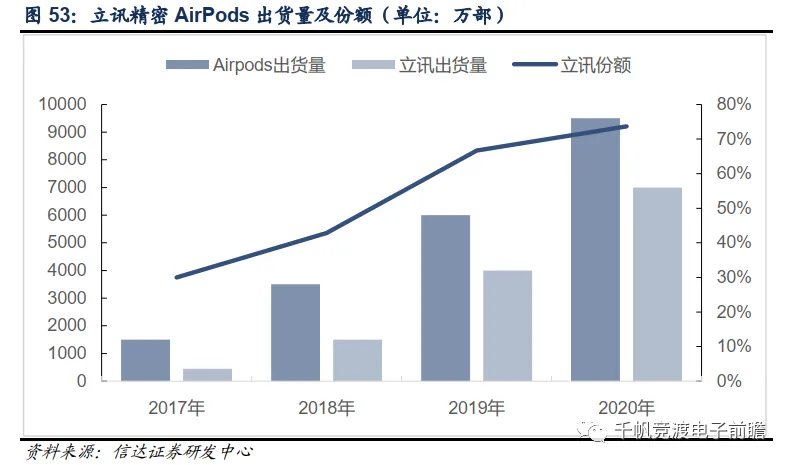其中立讯于2017年7月导入AirPods整机制造,2018年成为主力供应商,2019年AirPods全年出货量为6000万部,而立讯全年出货约在4000万部,份额近七成。目前立讯精密更是独占了AirPods Pro的供货,在二代AirPods上亦维持了极高的市占率。我们预计全年份额将在75%以上。
