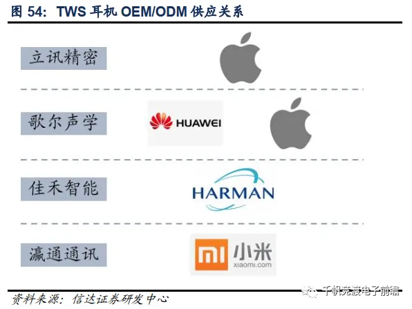 除上述元器件外,OEM/ODM业务也是整个产业链中价值量聚集的一环。TWS耳机的整机复杂程度高、工艺难度大,需要模组厂在声学设计、结构设计、精密模具等领域具备相当的实力。目前主流的TWS耳机ODM厂商有立讯精密、歌尔股份、佳禾智能、共达电声等。