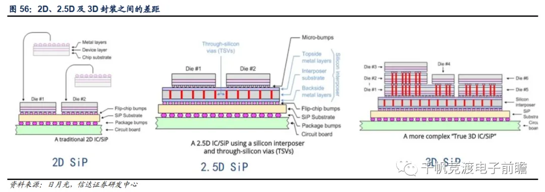 SiP根据集成度的不同,可分为2D,2.5D及3D SiP。其中2D SiP封装是将多颗平行的器件封在SiP基板上;后续演进出的2.5D封装在2D封装的基础上引入了硅中介层(Silicon Interposer),中介层上有TSV(硅通孔)连接其上金属层和下金属层,可以进一步优化性能和功耗。而3D封装更是可以实现芯片的3D堆叠,简单的3D封装可以将两个封装好的芯片堆叠在一起(POP封装),或者通过键合丝的方式实现内部互联,而较为先进的3D IC则是通过硅中介层+TSV实现多芯片的复杂堆叠。