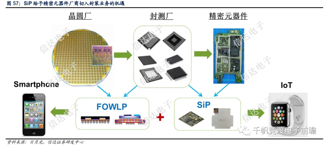 我们认为2D SiP方案模糊了封测和精密元器件厂之间的界限,给予一些技术实力较强的厂商切入封装业务的机遇。苹果Apple Watch的SiP封装便是交付给日月光的子公司环旭电子生产。而Airpods Pro第一代产品则是交付给韩系封测厂安靠生产,但后续其他龙头厂商也望打进供应链。目前已有较多国内龙头上市公司布局SiP领域,除前文提及的环旭电子外,长电科技、立讯精密、歌尔股份等公司皆已在SiP领域积极布局。