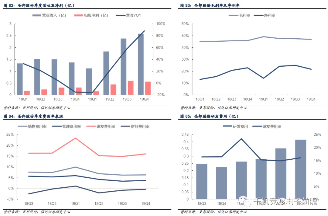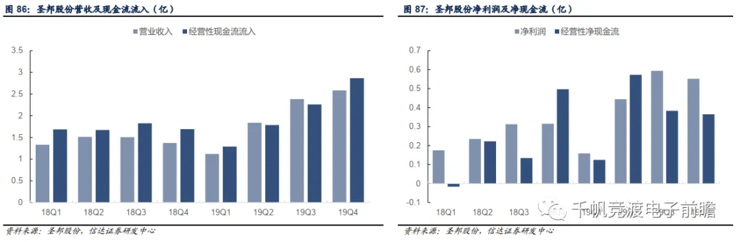 (1)深耕SiP技术助力增长,产品线全面布局成长可期:公司是SiP模组行业龙头,也是SiP微小化技术的领导者,2019年通讯类和消费电子类SiP业务为公司贡献了全年收入的主要增量,实现营收372.04亿元,同比增长近11%。目前公司SiP产品覆盖WiFi模组、UWB模组、智能手表SiP模组、TWS耳机模组、指纹辨识模组等。通讯方面,随着5G的加速渗透,通讯频段大幅增加,手机射频段元件数量大幅提升,带动SiP需求增长;消费电子方面,随着AirPods Pro率先引入SiP封装,缩小内部元器件体积、降低功耗的优势凸显,包括智能手表和TWS耳机在内的消费电子产品加速增长亦将带动SiP需求增加。在5G+IOT共同增长的时期,公司将受益于完备的产品线布局,SiP业务拥有强劲的增长动力。