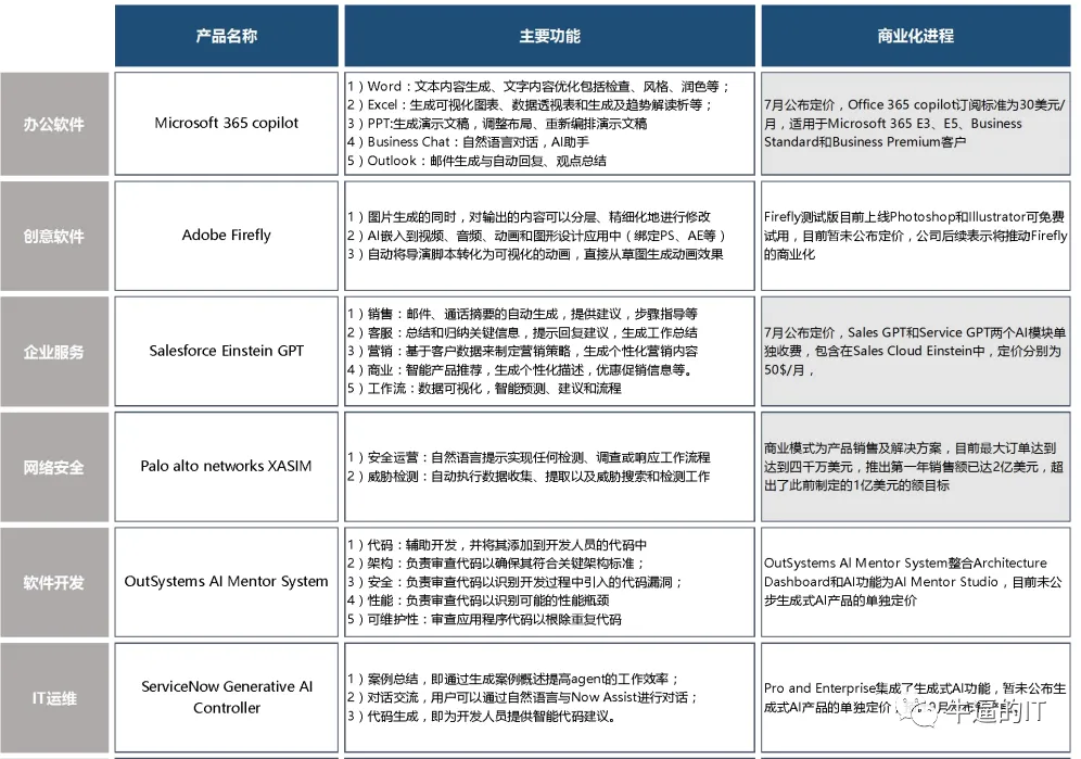在通用软件市场,生成式 AI 在办公软件、企业服务、IT 运维、软件开发、网络安全、数据智能等应用已经率先落地,并已经进入商业化的前期。主要赛道上均有标杆产品出现,大多数是智能助理(Coplilot)的形态。包括办公软件领域的 Office 365 Copilot,以及企业服务领域的Salesforce Einstein GPT,目前产品已经公布定价,预计将在四季度进入商业化落地的关键阶段此外解决方案型的 AI 厂商商业化落地的竞争更快,比如 Palantir、Palo Alto Networks 的生成式AI 产品已经在实际场景中得到应用且已经带来相应的收入贡献。具体来看。