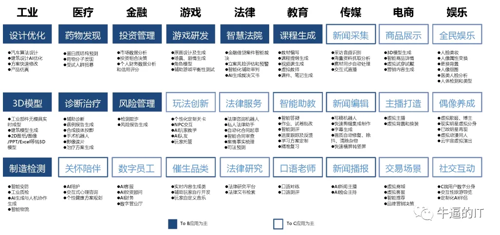 4)工业:当前大模型的应用主要聚焦在研发设计中的创成式设计、草图生成等辅助类设计的应用,以及运维管理中业务流程信息化 CRM、ERP 等软件,生产制造环节由于生产环境的安全性与稳定性要求较高,生成式 AI 技术应用还未完全成熟。目前,工业大模型参与者主要包括工业软件厂商、互联网科技厂商、平台厂商等,但由于工业场景的复杂度,很多数据不可读取,因此工业软件厂商、平台厂商通常与具备大模型能力的互联网科技厂商进行合作。