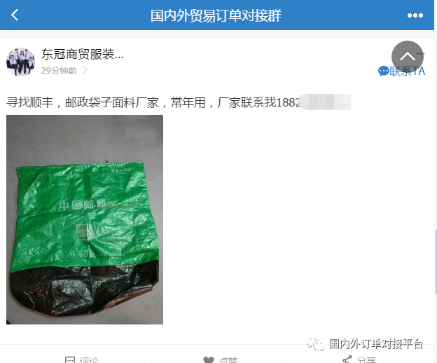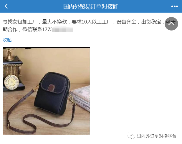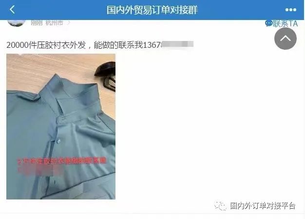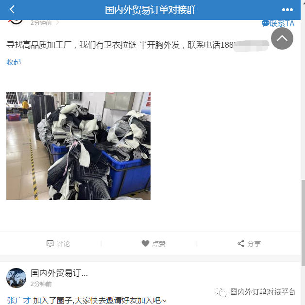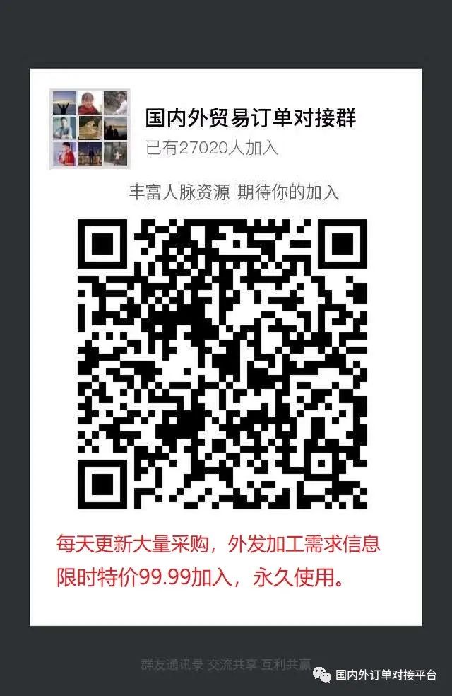 国内外贸易订单对接群已经入驻27000+用户,里面有国内外采购商,贸易公司,找订单,找加工厂,都可以快速对接。每天不定时更新外发加工以及采购需求,加入以后,直接跟客户联系对接,里面也可以发布你的产品信息做推广等多功能的圈子!