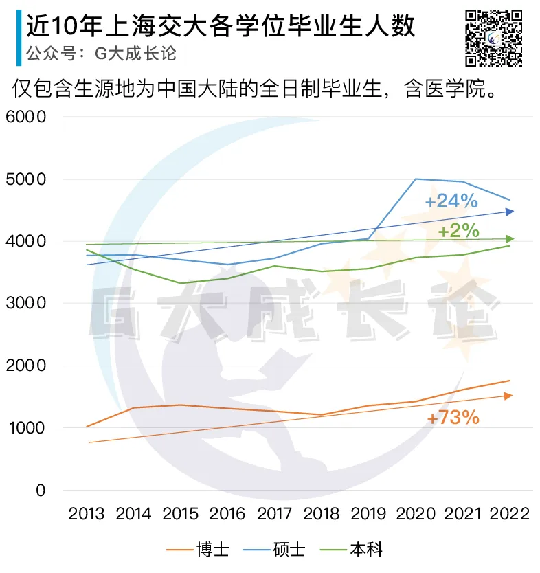 2013至2022这10年间,上海交大的毕业生总人数从8000多升至1万多,涨幅为20%。其中人数上升最快的是博士学位毕业生,涨幅高达73%,其次是涨幅为24%的硕士毕业生。