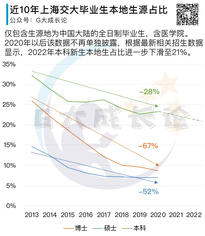 造成上述感知的另外一个主要推手,则是各位熟知的上海头部高校本地生源比例不断下降: