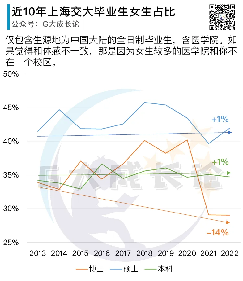 如图片注释所言,如果这和你的实际感受不一致,那么这是因为女生占多数的医学院和你并不在一个校区。医学院对性别的影响在硕士和博士段更加显著:由于临床等专业大量的本硕博连读,导致医学院的女生优势在硕博段的影响更大。