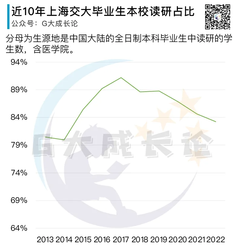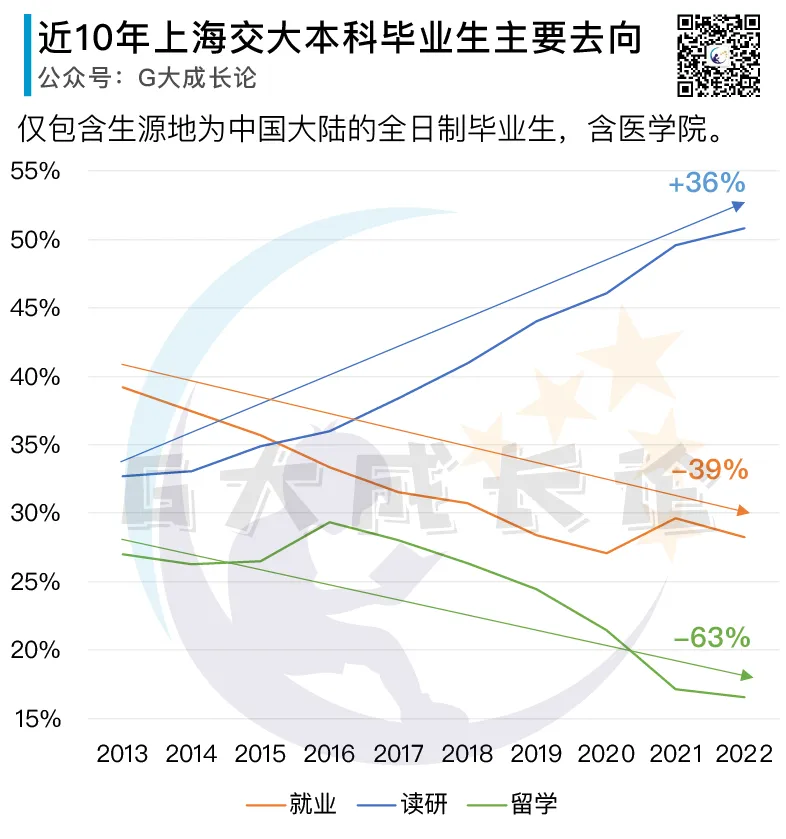 社会整体对学历要求的攀升,让即使是上海交大这个级别的毕业生,也逐渐减少本科以后直接就业这个选择的占比。与之对应,选择读研的本科毕业生占比,几乎呈一条直线坚决上升。