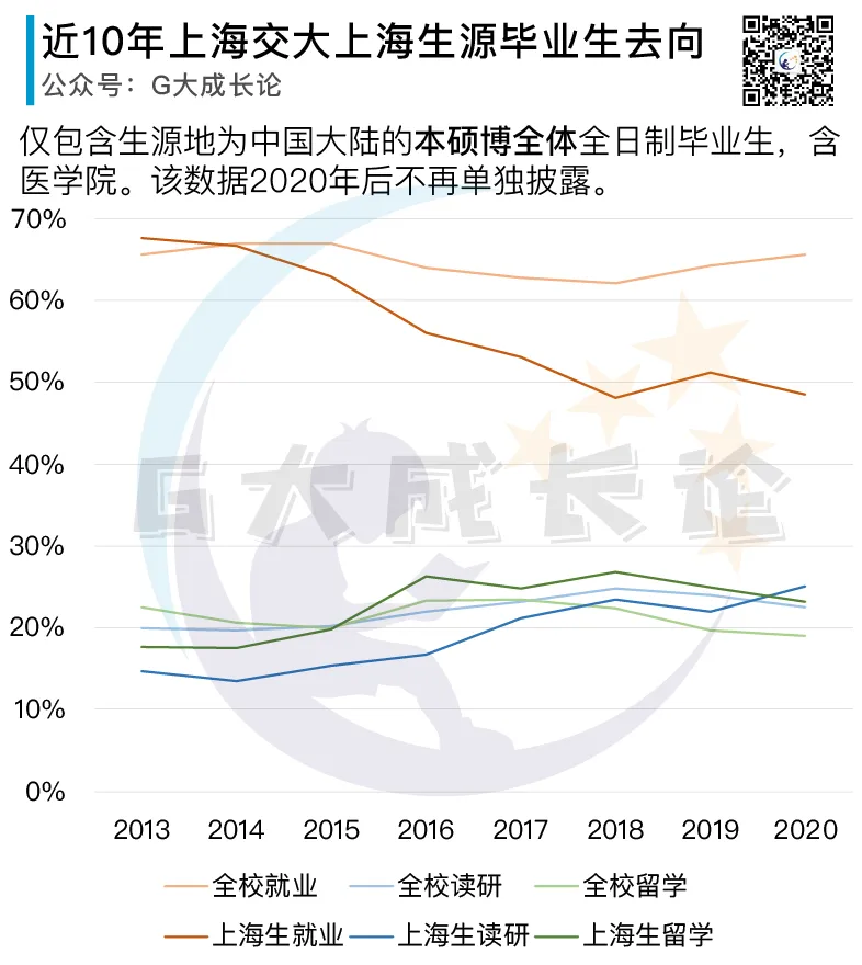 如果我们看本硕博全段,那么上海交大全校毕业生选择就业的比例始终维持在60%-70%之间。而其中上海生源则明显更少选择就业。