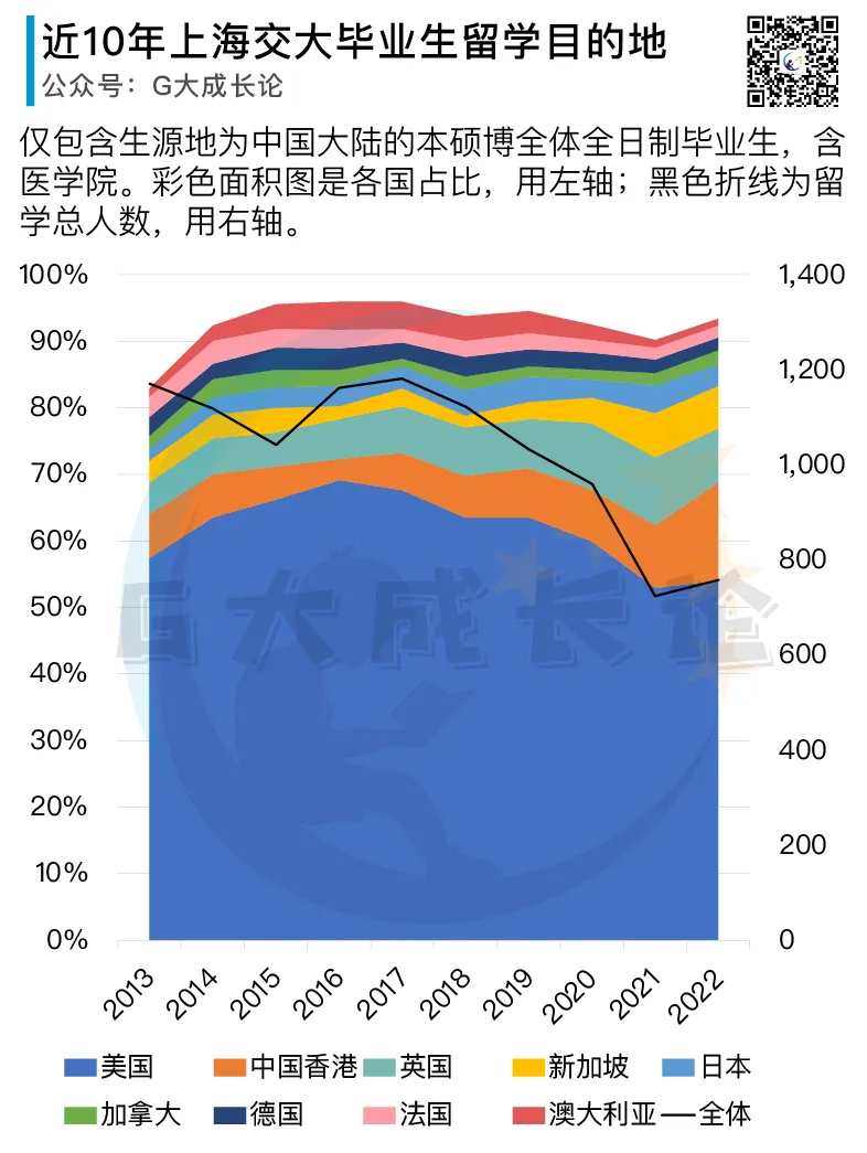 交大留学的目的地中,美国一直是绝对大头,直到特朗普出台限制中国学生赴美就读STEM相关核心专业。此后再叠加中美关系紧张、疫情、国内民间的仇美情绪等,使得2016年后交大赴美留学人数和占比都一路下滑。