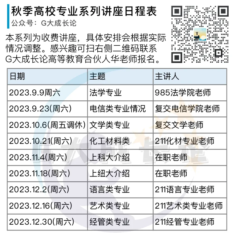 我的高等教育合伙人华老师目前正在筹备秋季学期的高校专业系列讲座,以下是日程安排,感兴趣的可以加她微信报名。