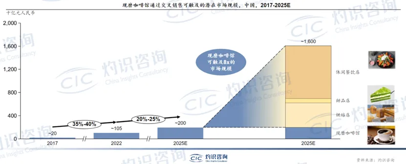 CIC灼识咨询发布的《中国咖啡行业蓝皮书》显示,咖啡消费的高频率为其它食饮行业交叉销售创造了机会,如烘焙产品和简餐类产品,逐渐模糊了不同业态间的界线,大大延长了品牌的消费时间和场景,触达8倍于咖啡馆业态的市场。因此,新式食饮行业的发展不是孤立的一条线,更多是环环相扣,共同繁荣。