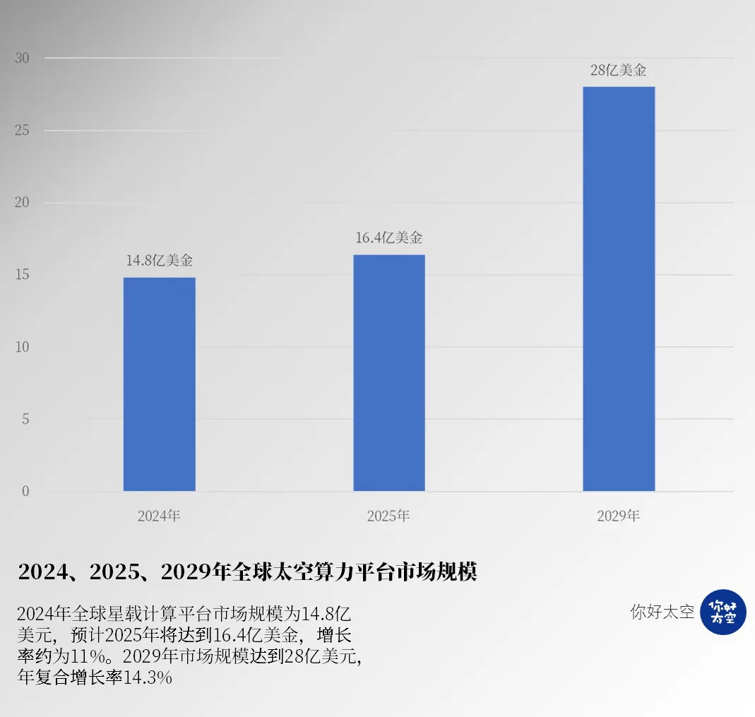 长期来看,太空计算受AI算力需求的带动,将在未来5年内保持约14.3%的高增速,预计2029年市场规模达到28亿美元。这一增长主要得益于商业航天事业的持续扩张、对卫星自主计算的需求以及AI在航天应用中的创新性使用。新兴趋势包括将人工智能集成到空间计算平台、软件定义空间系统、机载机器学习以及空间计算组件的持续小型化。