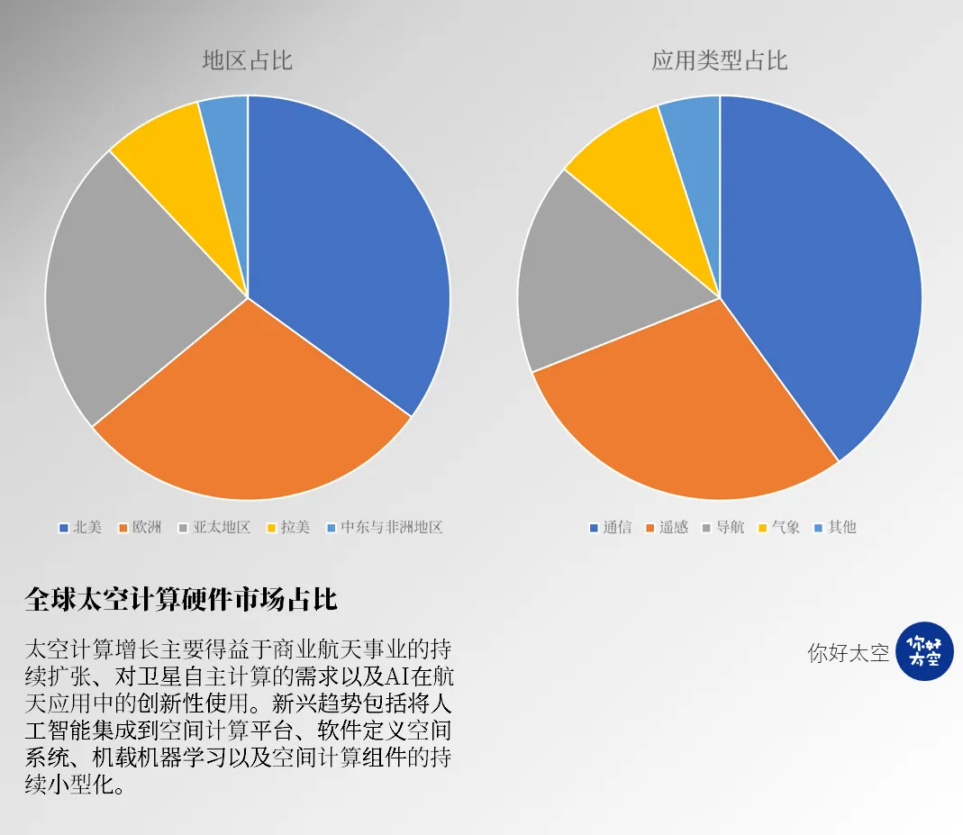 按照地区来看,北美以35%的市场份额成为全球最大的太空计算市场,其次为欧洲29%,亚太地区24%、拉美8%、中东与非洲地区和占4%。未来亚太地区将成为未来太空计算的主要市场。