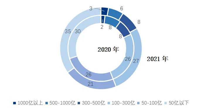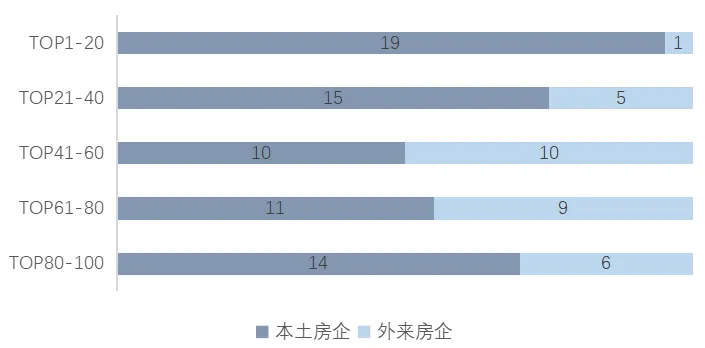数据来源:《2022广东省房地产企业综合竞争力研究报告》从入围房企销售额分档来看,2021年销售额过百亿的共有44家,基本与去年持平。其中,有3家销售额过千亿,分别为保利发展、碧桂园以及万科,较2020年增加1家;500-1000亿元的有6家,300-500亿元的有8家。数据来源:《2022广东省房地产企业综合竞争力研究报告》从入围企业属地看,本土房企占比69%,外来房企占比31%。与2020年基本持平。从结构上来看,龙头企业仍以本土房企为主,TOP20房企中共19家本土房企上榜,仅1家外来房企,TOP40房企中仅有6家外来房企,TOP40之后是外来房企主要集中的区域。图:入围企业本土房企及外来房企分布情况