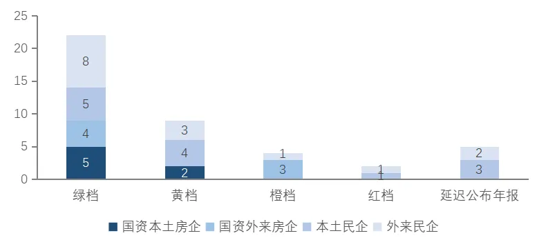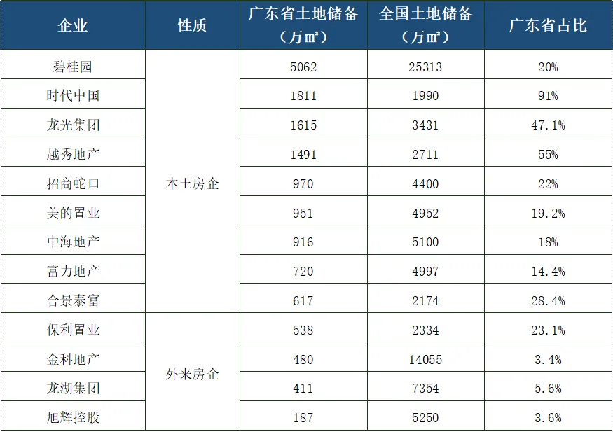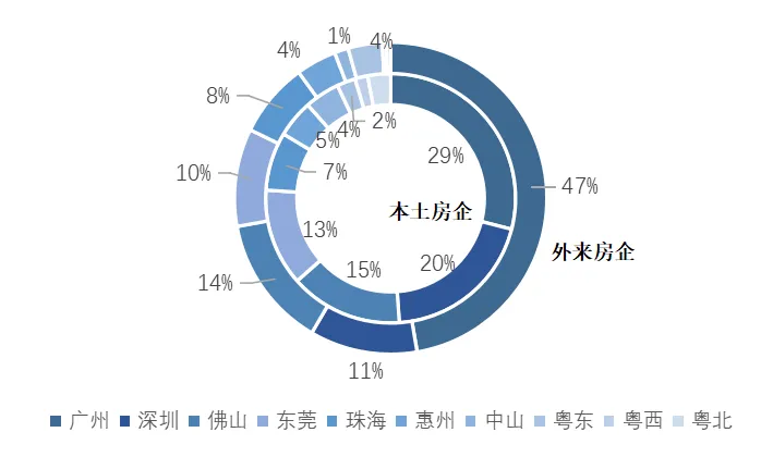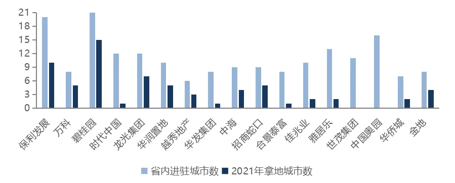 从企业所有制的角度看,入围企业中,国资背景房企共31家,民营房企共64家,外资房企共5家。国资房企主要集中在TOP40房企,共16家,其中TOP10房企中更是有7家为国资房企。数据来源:《2022广东省房地产企业综合竞争力研究报告》 从主要城市销售占比来看,龙头房企聚焦核心城市群,粤港澳大湾区中的广佛都市圈、深莞都市圈贡献销售额比例较高,多以广州、深圳、佛山、东莞、惠州、珠海等城市为布局重点。外来龙头房企广佛市场贡献销售收入比例比本土房企更高,这是由于广州、佛山土地供应量相对充足,且市场需求量较大,市场活跃度较高,成为较多外来房企入驻广东省的首选城市。图:百强龙头房企2021年主要城市及区域销售占比情况广东省活跃的房地产市场、人口持续增长带动的房地产需求旺盛也持续吸引本土及外来房企“加码”省内市场,龙头房企省内业绩贡献度持续提高。图:部分房企2021年广东合约销售额占总销售金额比重▌市场布局:龙头房企布局分化,聚焦高能级城市与多点全面布局并存省百强房企的TOP20房企中,以本土房企为主的部分房企基本实现全省布局,如碧桂园已实现全省21个城市的布局,保利发展布局了除云浮以外的20个城市。部分房企以粤港澳大湾区内城市为布局重点,省内其它区域性重点城市为辅,如龙光集团除了布局粤港澳大湾区内城市以外,还重点布局了汕头等城市;招商蛇口布局粤港澳大湾区内城市以及湛江、汕头等粤东粤西重点城市。另一方面,更多的房企以聚焦一二线核心城市及周边城市为主,如万科仅布局省内8城,越秀地产、华发集团主要布局其大本营以及周边城市。从2021年龙头房企拿地城市数来看,房企“聚焦发展”特点显现,仅碧桂园和保利发展两家房企在10个及以上城市成功拿地,其余房企拿地城市数均在个位数。这反映出龙头房企在去年的城市布局以稳为主,提高投资的确定性。2022年,市场仍处于调整期中,预计多数房企仍维持相对稳健的市场布局,先稳住已进驻城市的基本盘,谨慎投资。图:部分龙头房企省内进驻城市数及2021年新拿地城市数2021年上半年,广东房地产市场稳中向上,市场成交旺盛带动土地市场热度维持高位,房企拿地热情高涨,特别是大湾区内的广州、深圳、东莞、佛山、惠州、珠海等城市,房企积极争夺优质地块,多宗地块以高溢价率成交或触发摇号条件成交。百强典型房企中,民企积极拓展土储,上半年共新增土地储备1740万㎡,拿地金额高达1253.6亿元。央企、国企拓储相对稳健,上半年共新增土储1143.2万㎡,拿地金额1128.2亿元。下半年,密集调控下市场调整压力增加,房地产金融审慎管理效果持续显现,叠加重点城市集中供地严查购地自有资金来源等,部分民营房企资金面出现紧张,拿地热情退却,观望情绪渐浓。与此同时,央企、国企凭借较强的经营稳定性以及充足的现金流,成为托底土地市场的“定海神针”,国资背景的房企也顺势摘下多宗性价比高的优质地块,成功实现“抄底”。百强典型房企中,国资背景企业共新增土地储备916.8万㎡,拿地金额1204.1亿元,而民企仅新增土储534.1万㎡,较上半年大幅减少近70%,拿地金额仅335.1亿元。图:百强典型房企2021年上下半年拿地建筑面积及拿地金额本地房企深耕广东多年,对本地市场熟悉程度更高。近年来,房企拓展模式趋向多样化,通过招拍挂、城市更新等方式补充土地资源,土储量十分丰富。另外,以区域为重点布局的“粤系”房企广东省内土地储备亦十分丰富,多家房企在粤土储量超1000万㎡。外来房企近年也积极拓展广东的土地储备,随着粤港澳大湾区的规划逐渐落地,利好持续兑现,外来房企也积极布局湾区城市。表:典型百强房企截止2021年底广东省土储情况(规划建筑面积)▌“三道红线”达标企业数持续提升,降杠杆降风险需持续性随着行业进入缩表出清阶段,“唯规模论”已不再适用,百强房企更加强调财务安全与经营稳健。百强企业继续主动调整债务规模及结构,有息债务增速进一步放缓。截至2021年末,在已公布年报的省百强42家上市房企中,22家上市房企“三道红线”为绿档,国资背景的9家,民企13家。在目前行业调整期且伴随部分房企风险事件的持续发酵,财务稳健及拥有优质信用背书的企业更易受投资者和消费者的青睐,进一步转化成促进销售增长的强大势能。图:广东省百强上市房企2021年底“三道红线”分档情况2021年以来,“房住不炒”和“稳地价、稳房价、稳预期”的行业基调保持不变,房地产贷款集中管理制度严格落实,降负债、降杠杆、加速回款成为房企经营的主旋律。在此背景下,百强企业不再唯规模论,唯有在保证财务安全性和经营稳健性的基础上,才能行稳致远、实现高质量的发展。展望下半年,随着政策端、融资端对房地产市场的支持政策不断落实,市场将逐步走出调整期,购房者市场信心开始修复。百强房企应积极把握政策窗口期,加大线上线下营销力度,提升精细化管理水平,促进回款,稳健经营,实现高质量发展。获取更多中指报告 请在电脑端复制下方链接↓