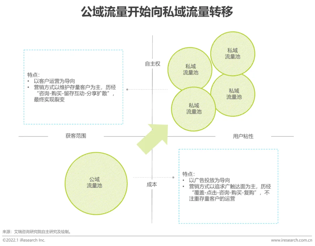 据CNNIC数据显示,近年来中国网民及互联网普及率不断提高,商家在流量红利逐渐见顶的市场中抢占份额,竞争加剧,导致公域流量平台获客成本逐渐攀升,企业纷纷转向私域玩法,建立能拥有流量自主掌控权、能直接触达客户的流量池。同时,私域流量红利期的到来使企业开始逐渐摒弃以获客为主导的传统流量思维,转为以用户思维为核心,运营的重心从依靠公域平台拉新流量转向对私域平台内存量用户的精细化运营。针对不同的用户类型,推送不同的产品和服务,做到真正以用户的需求为中心,以此留住流量,为转化做铺垫,“营销-销售-客服”的一体化趋势开始加强。