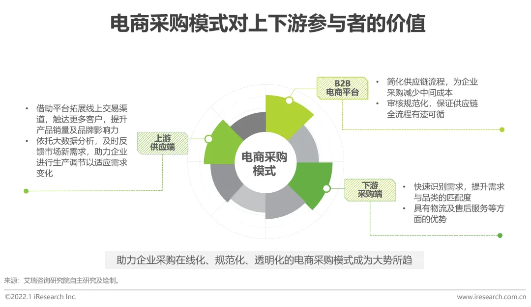 传统采购模式下,产品质量、物流管理及后续运维服务均缺少风险把控,且存在断供风险;同时,供应链整体链条冗长,上游供应端及下游采购端信息不对称,使得企业采购效率低下。电商采购模式将C端供应链模式应用于B端,借助大数据支撑,电商平台能够根据交易数据反馈,使得上游供给商一方面可以快速识别客户新需求,满足采购需求的多样性,另一方面可根据需求变化调整定价及生产计划,使供给更具弹性和灵活性。对于下游采购企业而言,电商平台依托品类丰富、买卖关系稳定等优势,为终端采购者提供一站式集中采购服务,在缩短采购环节、节约采购成本的同时,也为商品的有效供应提供了保障。