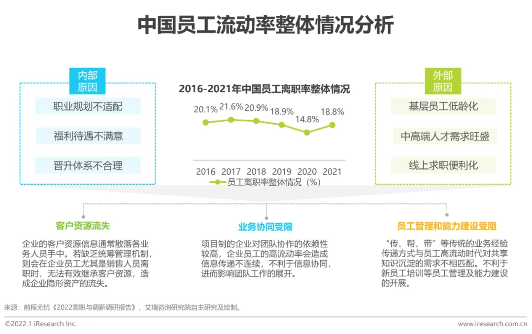 据前程无忧《2022离职与调薪调研报告》显示,2021年员工整体离职率为18.8%,较2020年有4%的回弹(2020年受疫情影响,中国员工整体离职率较低)。员工离职一定程度上造成了企业资源的流失;业务协同遭受限制;同时也会影响业务经验的共享与沉淀,不利于员工管理及能力建设。如何有效存留企业资源,并沉淀为赋能于企业的价值性资产,是当代企业在员工高流动率大环境中亟需破解的难题。