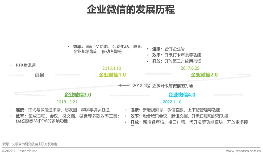 连接 · 效率 · 开放,企业微信功能不断完善,价值逐步释放2016年,企业微信1.0上线,主要聚焦于IM场景;2017年,企业微信 2.0上线,合并企业号,API逐渐丰富;2018年,企业微信与微信会话消息、群聊实现互通;2019年,微信第三方外挂软件被封,用户开始大量向企业微信迁移;2020年,以疫情为契机,以私域营销和政企服务为突破口,企业微信开始向更多场景渗透,助力企业数字化升级,生态初步成型;2022年,企业微信在协同办公、客户管理、开发接口等方面进一步升级,上线4.0版本,实现了1000w真实企业数量、1.8亿活跃用户、5亿微信用户连接的体量增长。上线近6年来,企业微信围绕“连接、效率、开放”,不断完善基础功能和平台服务体验,在企业服务市场的价值正在加速释放。
