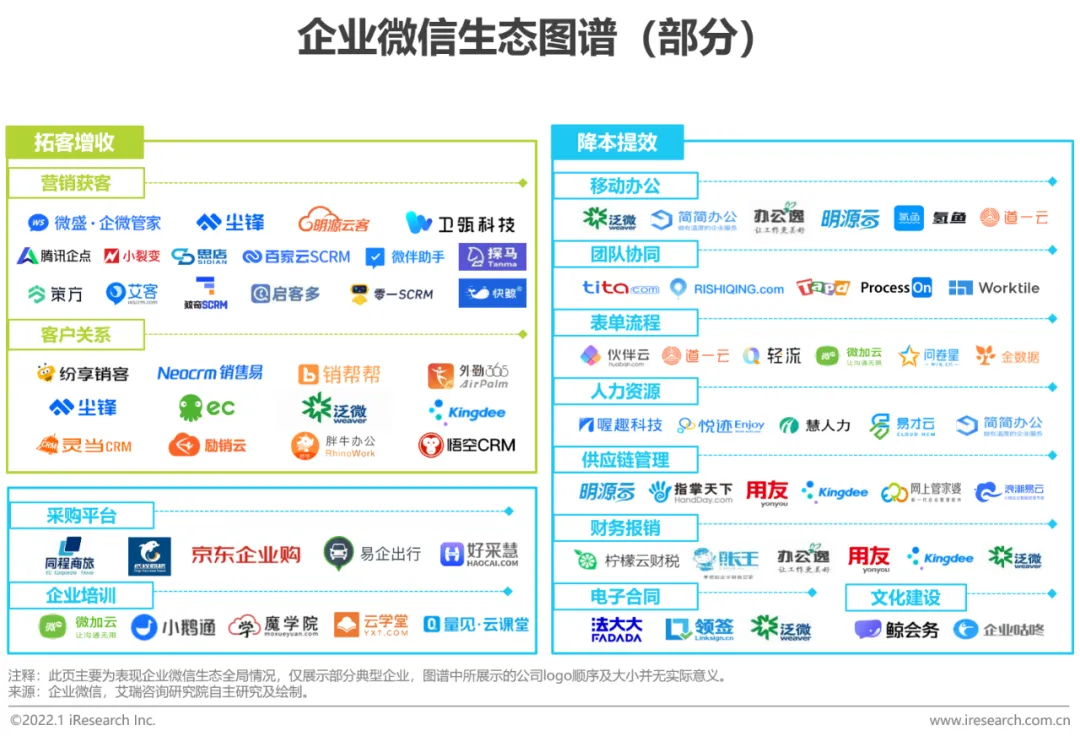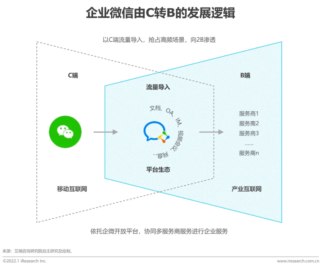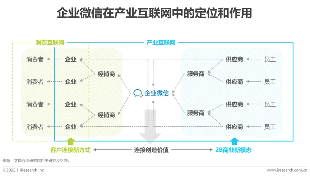 企业数字化转型的助推器,服务商生态合作的开放平台,产业互联的流转枢纽整体来看,企业微信在产业互联网中扮演着流转枢纽的角色,以平台的方式连接B2C(企业微信-微信-消费者、企业微信-员工)和B2B(企业-经销商-企业微信-服务商-供应商、服务商-企业微信-服务商……)多元场景。基于其强大的连接能力,企业微信积累了广泛的生态体系。进而,依托企微平台,生态内各厂商可以形成合力,为企业提供一站式的数字化转型解决方案,加速企业数字化转型。