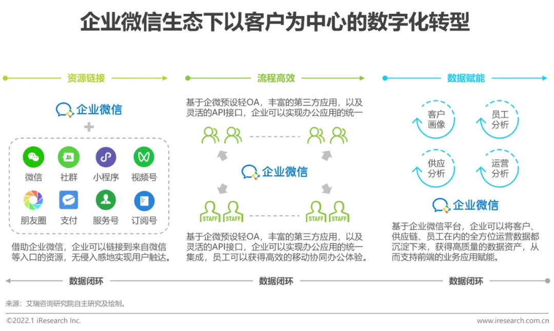 企业微信具有“资源链接、流程高效、数据赋能”的核心价值。向外,企微可以链接微信体系,无侵入感地触达到12亿用户;向内,企微可以实现办公应用的统一集成,让员工获得高效的移动协同办公体验;同时,企微可以沉淀真实数据,形成高质量数据资产,以数据驱动赋能前端业务应用。基于企业微信,企业可以无缝建立端到端的数据闭环,顺畅地实现以客户为中心的数字化转型。
