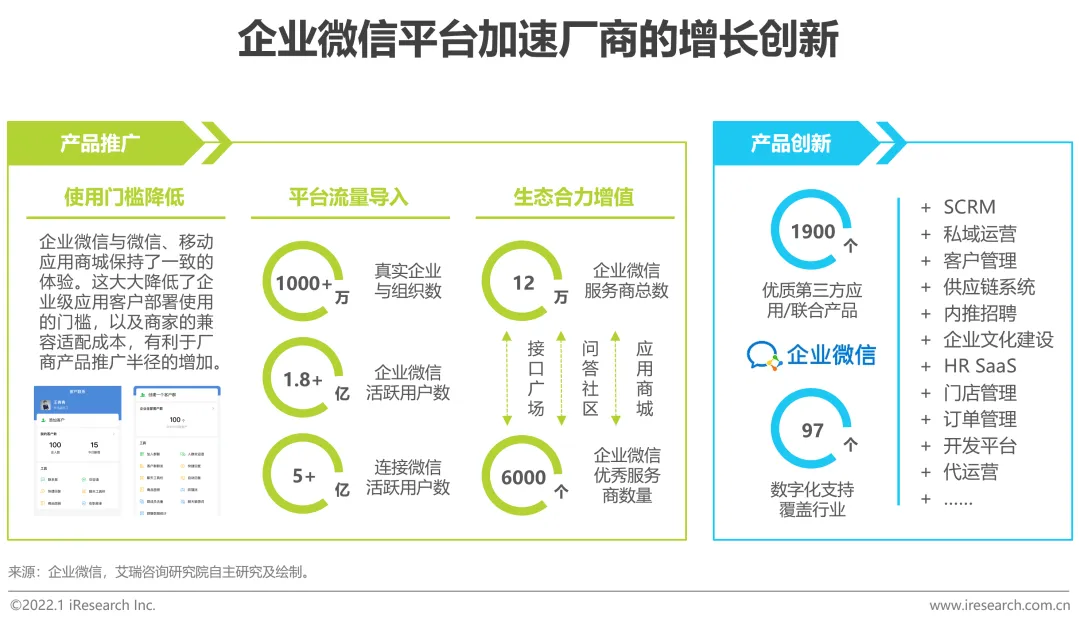 企业微信作为连接消费互联网和产业互联网的数字化平台,具有客户触达、流量导入、生态聚合及场景创新的价值,可以帮助厂商更好地进行产品推广和创新迭代。①产品推广:企业微信与微信互联互通,并沿袭了微信C端产品的体验,在导入流量、聚合生态的同时,降低了企业部署、员工使用和厂商兼容适配的门槛,可以帮助厂商更好地进行推广;②产品创新:企业微信以连接的力量打破了产业流程中的许多边界,形成了更大的生态聚合,并促生了更多的高价值场景。新场景为初创厂商和传统厂商都带来了更多的创新点和机会点。